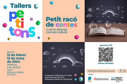 PETIT RACÓ DE CONTESA càrrec del grup “Fantasy corner”. Per a infants de 2 a 4 anyshttps://www.lleidaturisme.cat/ca/agenda/petit-raco-de-contes-3https://www.lleidaturisme.cat/ca/agenda/petit-raco-de-contes-3/@@download/image/Raco contes.jpg